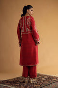 A deep red traditional ensemble featuring a straight-cut long shirt adorned with intricate white and gold hand embroidery. The embroidery highlights floral motifs and geometric patterns, placed prominently along the neckline, sleeves, and hemline. The shirt is paired with matching straight trousers in the same fabric and tone, creating a cohesive and elegant look. The overall design exudes timeless sophistication, making it suitable for festive occasions or semi-formal events. The outfit is styled minimally, allowing the hand embroidery and rich color to stand out.