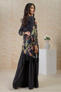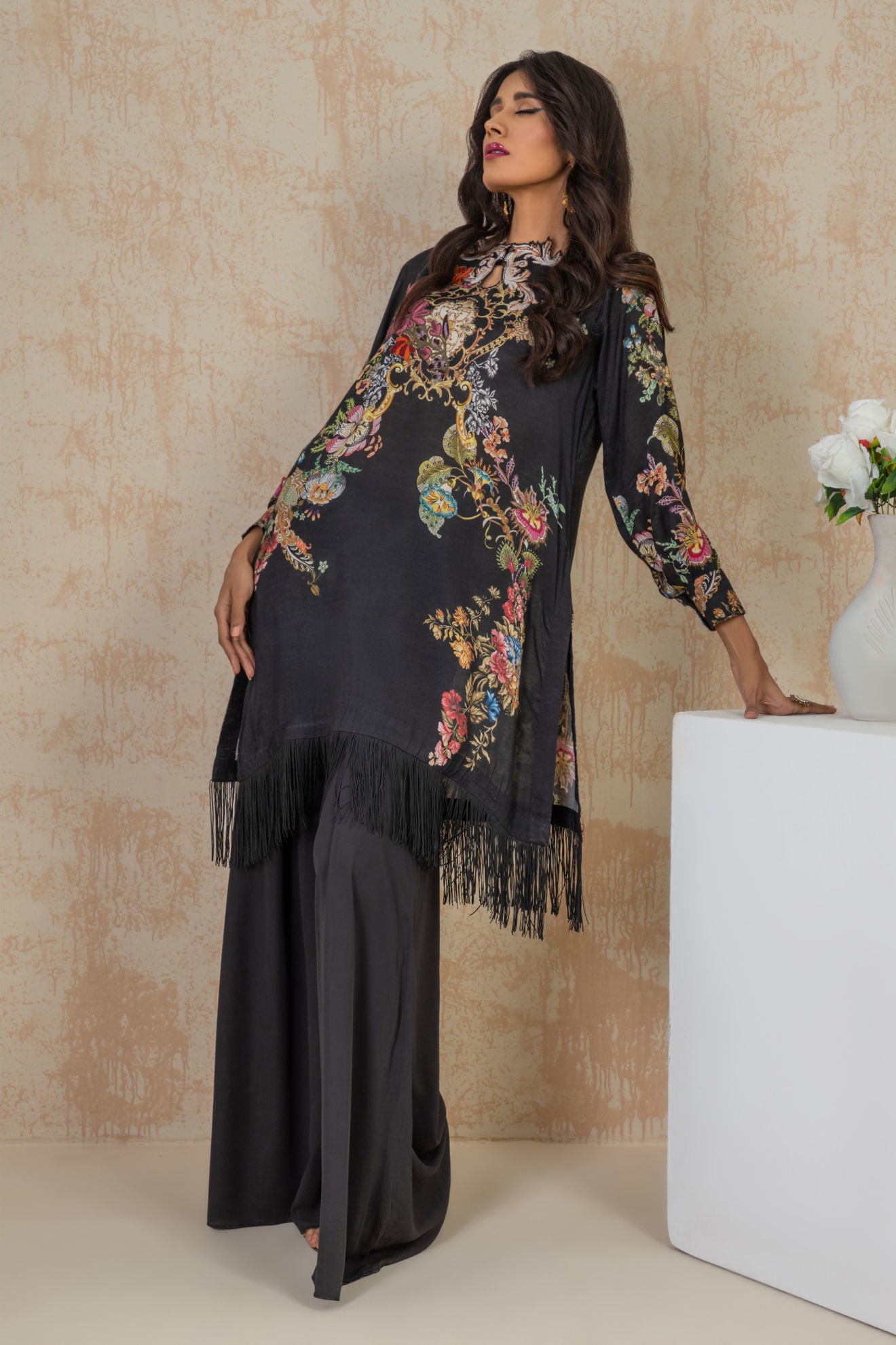 Straight shirt and cuff on the sleeves Floral print on khaddi silk fabric cutwork on the neckline delicate floral embroidered motif appliqued on the shirt finished with black fringes.
