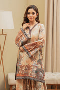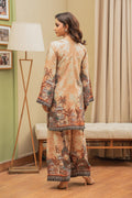 Make a subtle yet striking statement in this original Shamaeel print co-ord set, beautifully rendered in soft peach and terracotta tones. The relaxed-fit kurta features a deep V-notch neckline accented with a contrast border, complemented by full-length sleeves and a hem adorned with botanical print. Paired with Farshi shalwar that echo the same rich detailing, this two-piece ensemble blends comfort with quiet sophistication. Crafted in a soft, breathable fabric, for all-day wear, perfect for Eid, casual outings, daytime events.