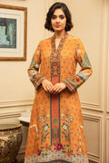 A statement piece from Shamaeel, this long, A-line shirt is rendered in a warm orange hue,and digitally printed floral patterns. The neckline boasts luxurious outline in gold with ethnic accents, while the sleeves and hem are highlighted by elaborate print borders in contrasting tones. The piece is further enhanced with half inch embroidered border on the sides of the slit, comes with the pant, making it a perfect blend of traditional artistry and modern tailoring. Ideal for festive occasions and cultural gatherings.