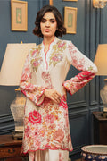 A refined two-piece set that exudes timeless elegance. This Shamaeel Ansari ensemble features a short, straight shirt, delicate intricate on side of neckline, and adorned with embroidered border on neckline paired with a farshi shalwar. In serene white and pink tones, this set seamlessly blends sophistication with a refreshing burst of color, making it an exquisite addition to your wardrobe this summer season, all day wear, Perfect for Eid look and casual outings.