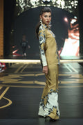 This ensemble is a chic, contemporary take on coordinated separates with artistic flair. A button-down collared shirt made from glossy satin fabric, designed in a striking two-tone block one half in mustard gold and the other in ivory, both printed with an intricate black floral botanical pattern. The split-color design gives it a modern, graphic edge while maintaining softness through the floral motif it comes with a matching flared trousers in mustard gold with wide ivory panels inserted at the front, continuing the same floral print from the top. The contrast panels create movement and elongation, giving the pants a stylish fluidity down the runway. It’s a sophisticated and artistic set that stands out for its clever play of color blocking, print symmetry, and relaxed tailoring, perfect for someone who loves subtle drama in a coordinated look.
