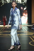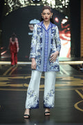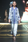 This look is a refined and feminine coordinated set with a timeless porcelain-inspired aesthetic. A long silk button-down shirt featuring a crisp lapel collar and tailored shape, beautifully printed in porcelain blue-and-white floral and chinoiserie motifs. The print placement is framed with vertical blue borders that draw the eye downwards, elongating the silhouette. Cuffed sleeves continue the print detail for a polished finish. It comes with a straight-cut satin trousers in a soft ivory base, delicately decorated with scattered blue floral print along the hem, creating a subtle, elegant continuation of the top pattern. It’s a graceful ensemble that feels classic yet contemporary, perfect for sophisticated daywear or festive lunches.