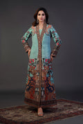 This exquisite aqua ensemble is a stunning fusion of traditional artistry and modern elegance. The front-open long jacket, in a mesmerizing aqua blue base, is adorned with intricate floral and Mughal-inspired prints in vibrant hues of red, gold, and deep blue. The rich embroidery, delicate sequin work, and ornate embellishments along the neckline and front panel add a regal touch.