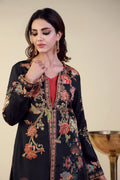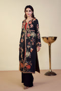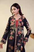 This front-open ensemble, crafted from silk fabric, features a beautiful floral print on a black base with intricate embellishments. The print is enhanced with a delicate golden outline, while the flowers are further adorned with exquisite sequin work—perfect for formal events or evening gatherings. The outfit comes with a red inner and black wide-leg pants.