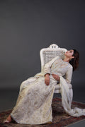 This exquisite front-open ensemble exudes timeless elegance, crafted from luxurious fabric in a soft ivory hue. The intricate embellishments feature delicate hand embroidery in silver and gold, shimmering sequins, and glistening beadwork, creating a mesmerizing effect. The structured silhouette is adorned with Mughal-inspired patterns, enhancing its regal charm. A subtle silver-lined border traces the neckline, front panel, and hem, adding a sophisticated touch. The sheer dupatta, finished with embroidered edges, drapes effortlessly to complete the graceful look. Perfect for weddings, receptions, and grand festive occasions, this masterpiece blends traditional craftsmanship with contemporary sophistication.