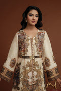 This signature Shamaeel straight-cut silhouette showcases a regal Baroque-inspired design on opulent sheesha silk. Intricately adorned with hand embroidery, elaborate embellishments, and antique gold outline, the ensemble radiates timeless grandeur. A printed, delicately embroidered belt cinches the waist, adding structure and completing the look with quintessential Shamaeel elegance, comes with pant. Perfect for intimate soirées, cultural celebrations, or refined evening affairs.