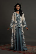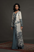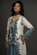 This Shamaeel ensemble masterfully blends tradition with contemporary elegance. The outfit features a long ivory A-line shirt adorned with teal blue prints and delicate embellishments, showcasing exquisite craftsmanship. A graceful front slit reveals a luxurious teal-colored skirt beneath, adding depth, dimension, and fluidity to the silhouette. This ensemble radiates sophistication, making it an ideal choice for formal gatherings and festive occasions.