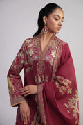 Effortlessly blending simplicity with sophistication, this red ensemble features a fully printed shirt paired with matching solid trousers for a seamless look. The soft lawn dupatta, detailed with green-accented borders, adds a subtle contrast that enhances the overall elegance—perfect for understated summer style.