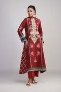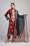 A nod to classic elegance, this three-piece ensemble features an old-school style shirt layout paired with solid trousers for a timeless look. The contrast blue airy silk dupatta adds a touch of sophistication and grace, enhancing the overall elegance and class of the outfit.