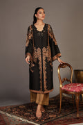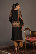 Jacket style front open shirt in Shamaeels signature print in gold tila outline, Hand touched in nakshi, dabka, sequence in gold Enhanced by using pearls and antique moti.Black and gold hand embroidered neckline in sequence , moti, naqshi and tila adds regal oomph to the shirt. It is paired with a loose pant. Dupatta can be added separately. Dupatta finished with half inch embroidered border.