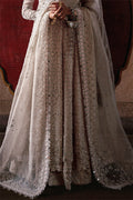 A white organza pishwaas with scoop neckline, fitted cap sleeves, self-embroidery with beads, mirrors, and pearls, scalloped hem, tasselled back, and layered cutwork finish.