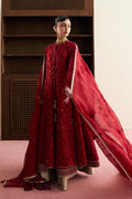 Fire red, double-layered (raw silk underlayer, organza overshirt) with embroidery, lace, and gold contrasts. Undershirt has churidar sleeves, overshirt has cape sleeves.