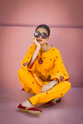 A vibrant yellow short khaddar shirt featuring intricate pomegranate embroidery, paired with a classic shalwar for a fresh, playful look.