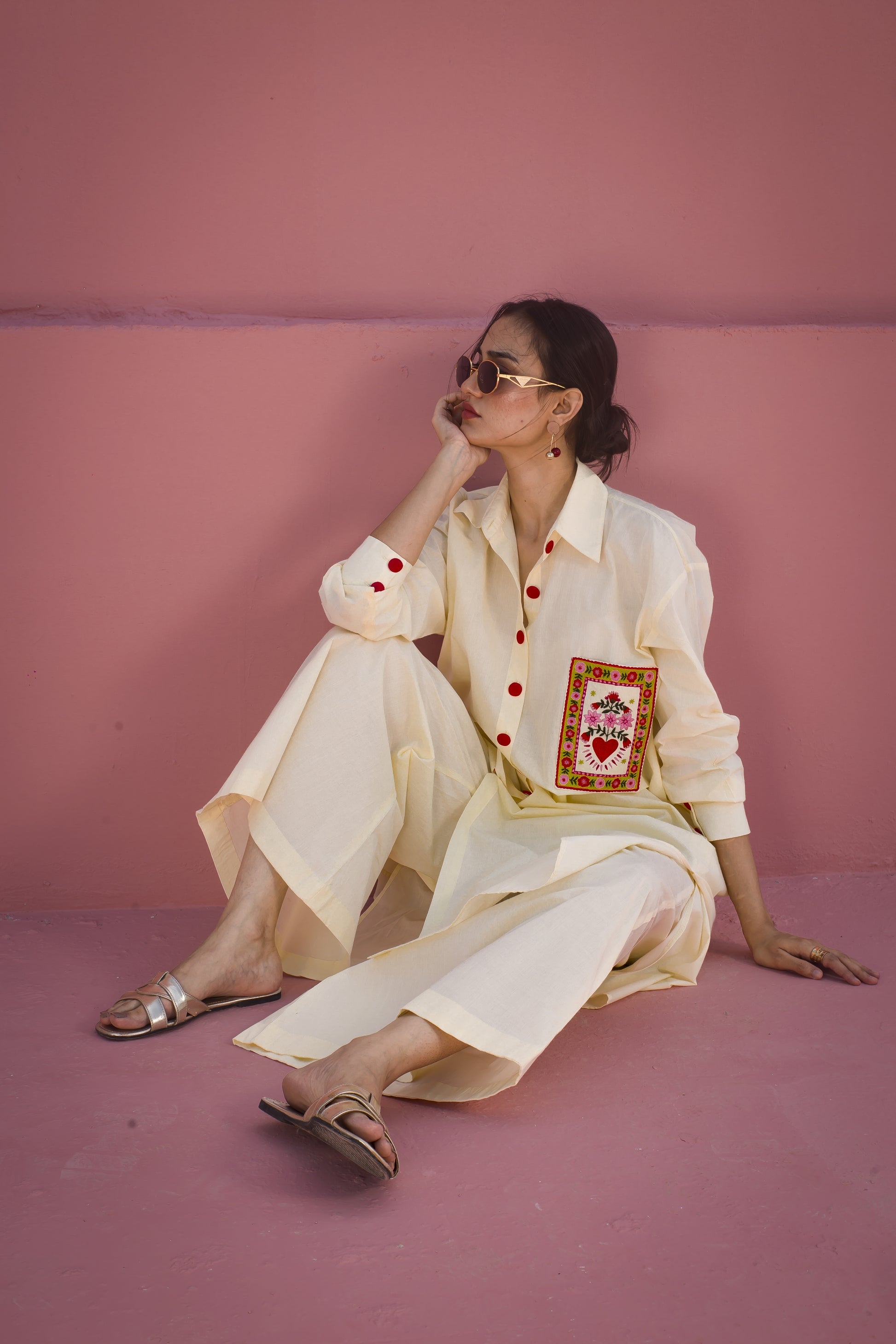 A long button-down khaddar shirt with detailed embroidery on the pocket, paired with culottes for a stylish and comfortable look.
