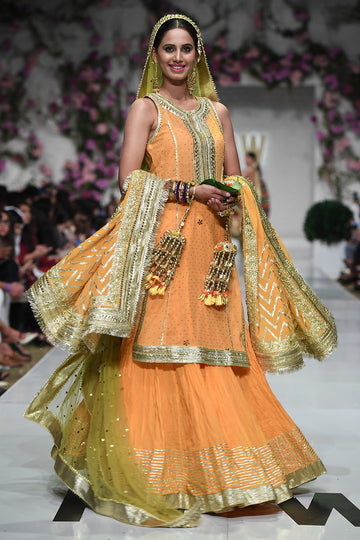 A stunning Mayon outfit consisting of a voluminous ghagra, shirt and dupatta in pure muslin with beautiful Kaamdani and traditional Gota work.