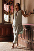 A graceful 3-piece pure silk outfit featuring a short, sleeveless straight shirt in a soft ice blue base, delicately block printed in silver and midnight blue for a refined, modern look. It is paired with a classic khari shalwar in matching ice blue, enhanced with subtle block print edging for added charm. The ensemble is completed with an ice blue dupatta, beautifully adorned with coordinating silver and midnight blue block prints, making it a perfect blend of elegance and contemporary flair.