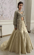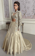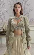 The show-stopping organza embroidered jacket with cutwork details and bishop sleeves adds a touch of elegance to your look. Paired with an intricately embroidered blouse featuring faux mirror embellishments and the voluminous organza skirt adds a touch of drama to complete the look.