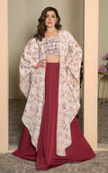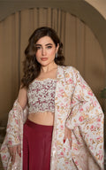 The extravagant ensemble featuring a mesmerizing embroidered blouse embellished with pearls, sequins, and crystals. Paired with a printed stylish long floral cape adorned with sequins lining and a matching skirt, this ensemble exudes glamour and sophistication.