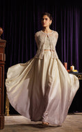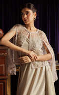 Unleash your inner style icon with our lavish embroidered cape, intricately detailed with pearls, cut glass beads, and crystals for a truly luxurious touch. Paired effortlessly with a shimmering Tube top and double shade chic skirt, this ensemble is a must-have for fashion-forward individuals.