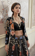 Indulge in the ultimate sophistication with our sequins blouse paired with a fashionable floral printed jacket and lehenga. This elegant ensemble is a true showstopper, combining shimmering sequins with a stylish design for a look that is both timeless and on-trend. Make a lasting impression with this luxurious outfit.