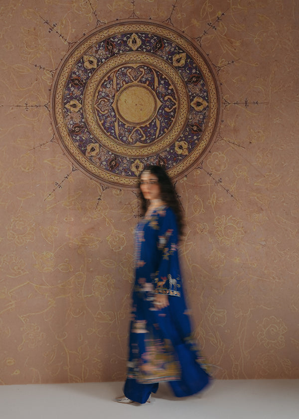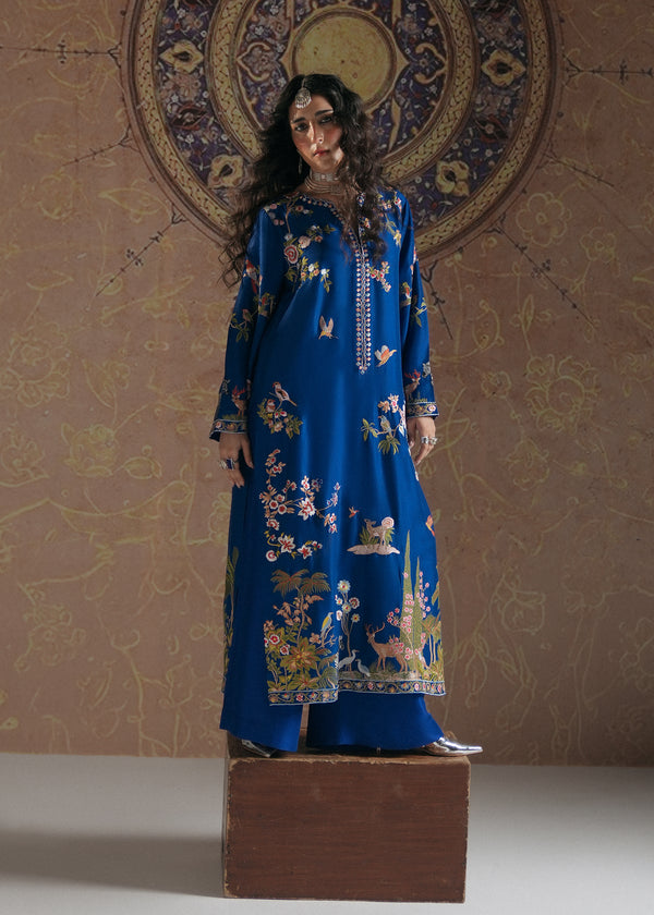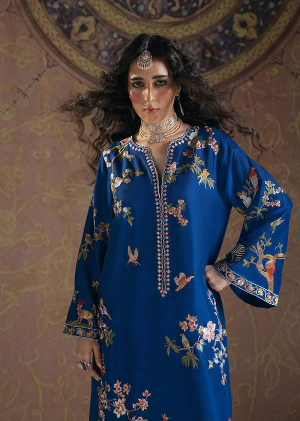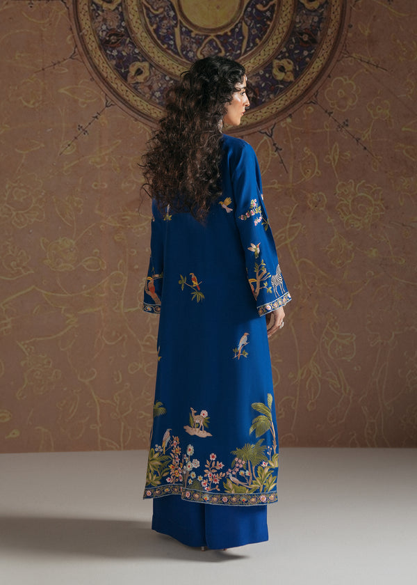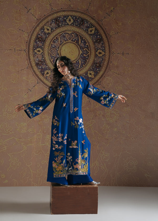 This stunning ensemble is crafted from pure raw silk, exuding elegance with its natural sheen and luxurious drape. The design is adorned with intricate embroidery inspired by Shikargah artistry, depicting a timeless narrative of flora and fauna in vibrant threadwork. The deep royal blue base enhances the detailed motifs of birds, animals, and nature, creating a regal and sophisticated look. Paired with wide-legged raw silk trousers, the outfit strikes the perfect balance between tradition and modern refinement—for making a bold cultural state.