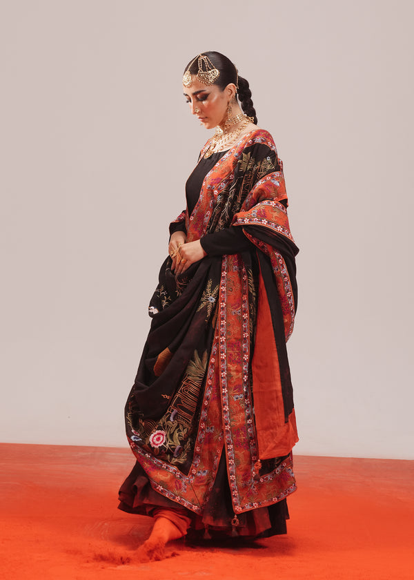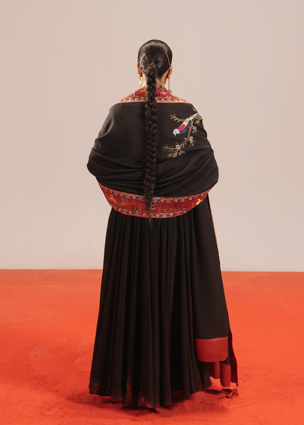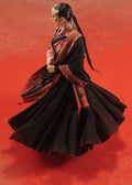 A timeless ode to tradition with a modern twist — this black Peshwas ensemble is crafted in voluminous cotton net fabric, inspired by the grandeur of the old Peshwas silhouette. Its flow and structure embody elegance while retaining a sense of heritage. Paired with it is the statement Roomi Shawl, designed in pure raw silk with delicate sheesha silk borders. The shawl features modern embroidery that beautifully contrasts with the classic peshwas, bringing a touch of luxe craftsmanship. This ensemble harmonizes the past and present, making it a perfect reflection of artistry and sophistication.