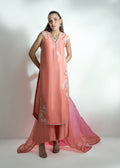 A charming coral pink shirt featuring delicate embroidery with 3D leaves artistically placed in an asymmetrical design, complemented by elegant embellishments that add a subtle sparkle. Paired with luxurious pure silk culottes for a refined silhouette, and finished with a sheer pure organza dupatta.