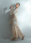 This contemporary ensemble features a chic front-open short jacket made from sheer organza, intricately embroidered to perfection. Underneath, a beautifully embroidered organza bustier adds structure and elegance. The look is paired with a uniquely tailored U-shape shalwar, crafted from luxurious pure crepe fabric. With its modern cutline and refined detailing, this outfit is a bold fusion of tradition and high-fashion flair—ideal for making a statement at any stylish occasion.