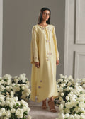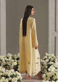 Crafted from pure raw silk, this kaftaan ensemble radiates luxury with its smooth, lustrous finish. Delicate floral embroidery, accented with 3D butterfly embellishments and lace-up detailing at the neckline, lends a sophisticated edge to the design. Paired with a sheer organza dupatta and tailored culottes, it stands as a true statement of refined style.