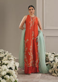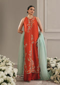 Rendered in a delicate carrot red, this breezy pure raw silk jacket is adorned with intricate needlework and gold-and-white floral embroidery, exuding effortless sophistication. Styled with a cascading sky-blue organza dupatta featuring artisanal cutwork and edging, the ensemble strikes a refreshing balance of vibrance, elegance, and refined artistry.
