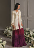 Bathed in a soft ivory glow, this pure raw silk jacket is a vision of refined elegance. Adorned with intricate threadwork and delicate hand embellishments, it is framed with dainty blush and gold borders. Beneath, a cascade of crushed silk izaars flows in a mesmerizing gradient — shifting from rich raspberry red to deep plum, creating a striking play of color and movement.