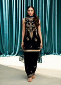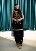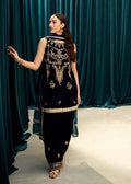 The sapphire blue velvet short shirt featuring heavy antique gold embroidery that cascades beautifully along neckline front/back .the ornate motifs gives it a rich ,classic look, perfectly paired with deep blue dupatta adorned with gold accents .the contrast of navy blue and gold brings timeless festive charm -ideal for evening events on formal celebrations .it has a straight Khari shalwar with hand worked booties and a border on it. the shirt has a back keyhole with a hanging tassels on it which complete the look of the outfit