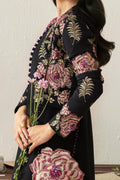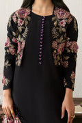 A 3-piece ensemble featuring a black shirt with slit embroidery and embellished front buttons, paired with embroidered embellished jacket and trousers.