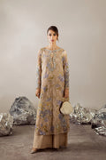 Chantelle dress featuring an elegantly crafted long shirt, adorned with delicate embroidery and exquisite hand embellishments paired with raw silk wide-legged trouser