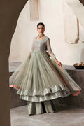Ash gray net pishwas with intricate sequin embroidery and double sequin borders, paired with raw silk foil-printed trousers and an embroidered scalloped dupatta for a graceful festive look.
