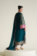 A rich teal green chiffon long shirt adorned with vibrant embroidered details, paired with a matching chiffon dupatta and plain trousers for an elegant, refined look.