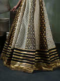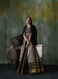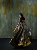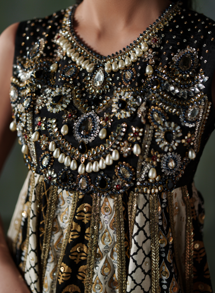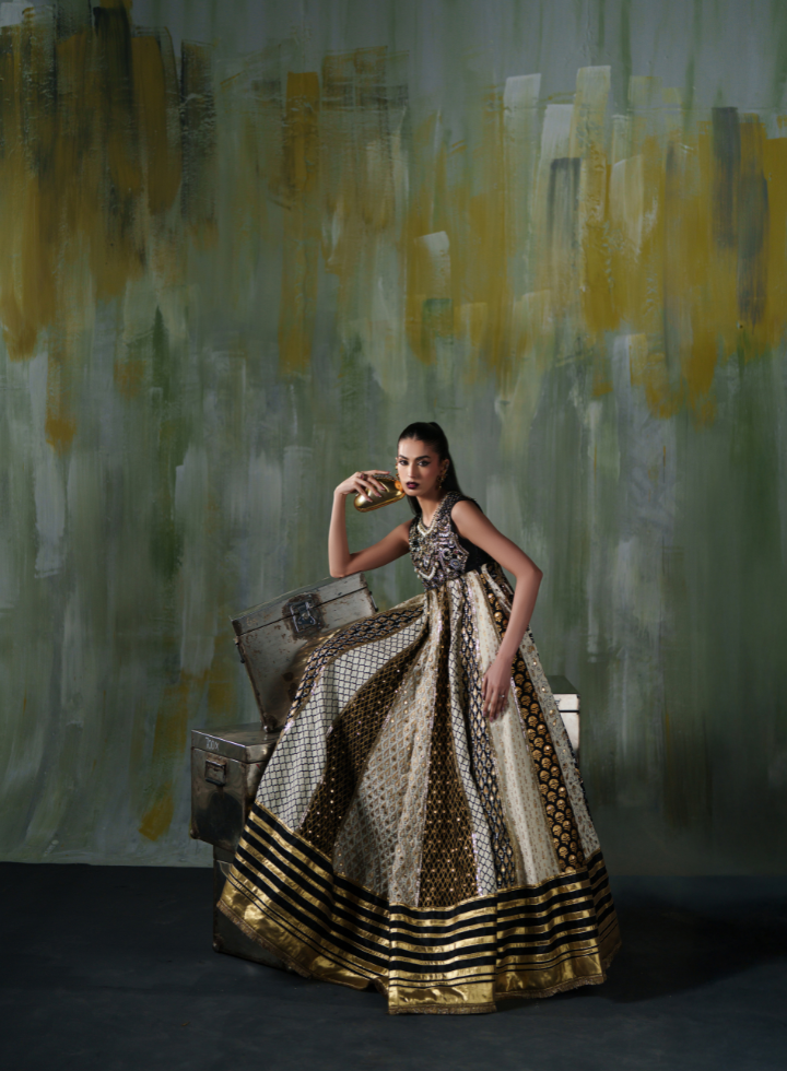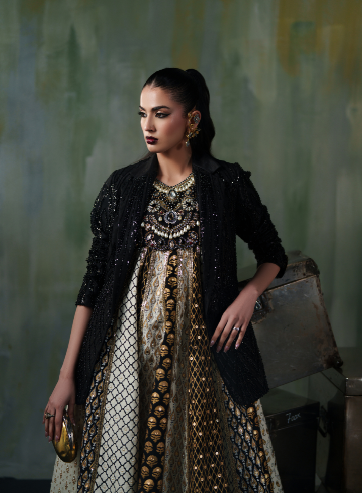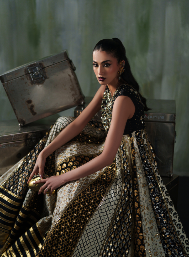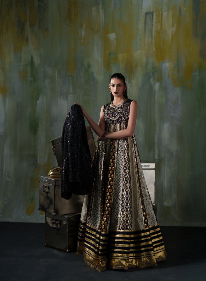 The Majestic Gold Noir is a floor‑length, premium anarkali ensemble featuring: