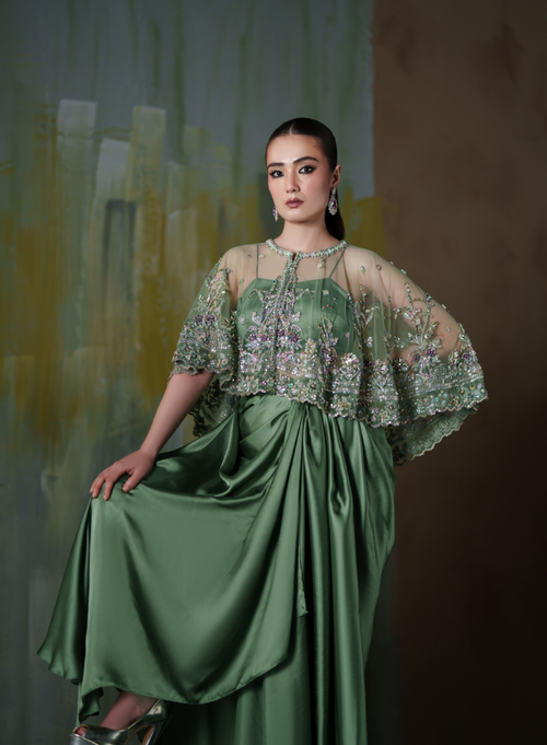 Bottom: flowing green satin skirt with draped detailing and a subtle gather at the waist.