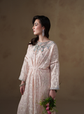 The kaftan-cut crinkle chiffon outfit in the image is a classic chicken kari (chickenkari) embroidered piece with these features: