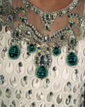 The white shirt is classic and neutral, offering a quiet backdrop for the richly detailed emerald stone and adda work
