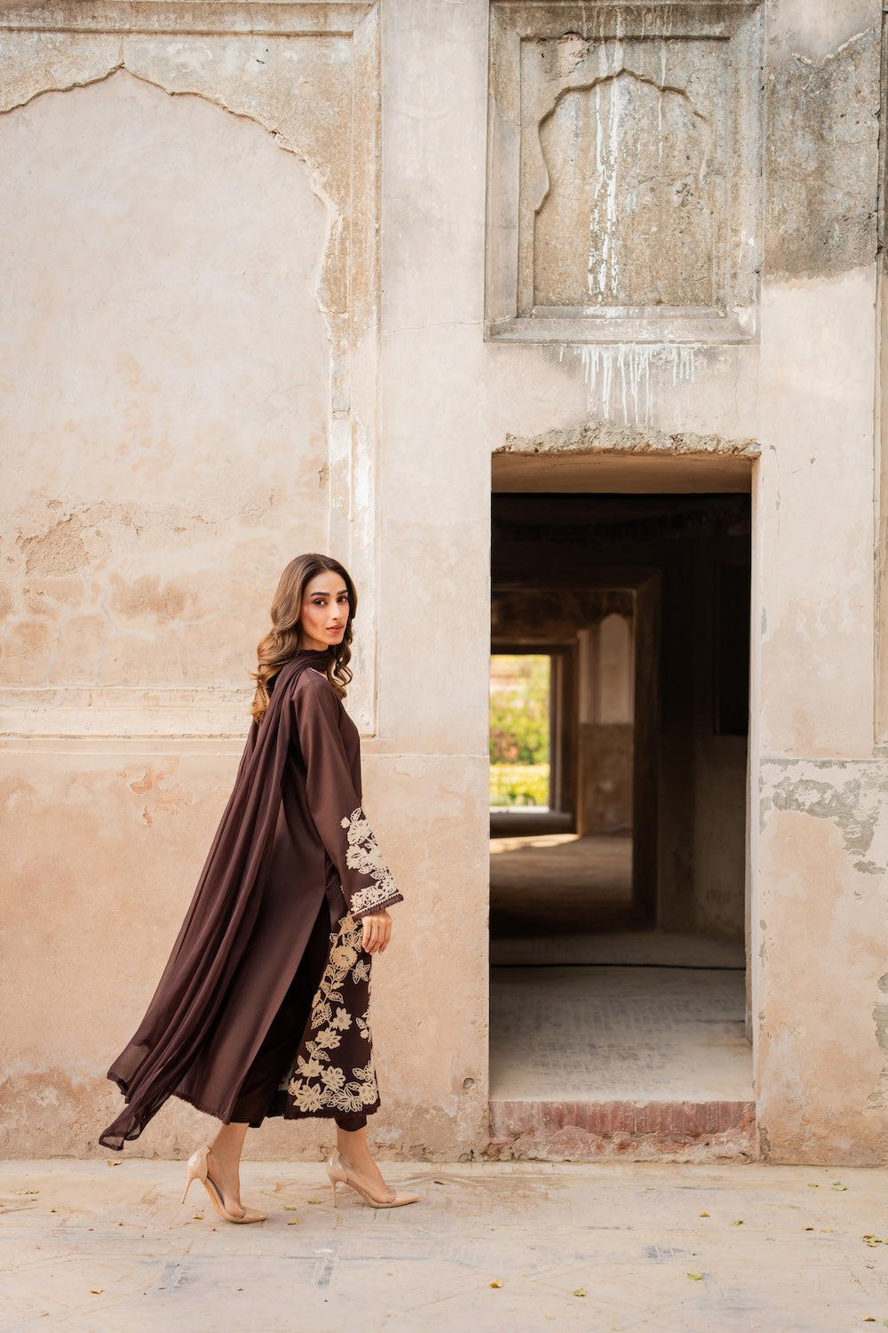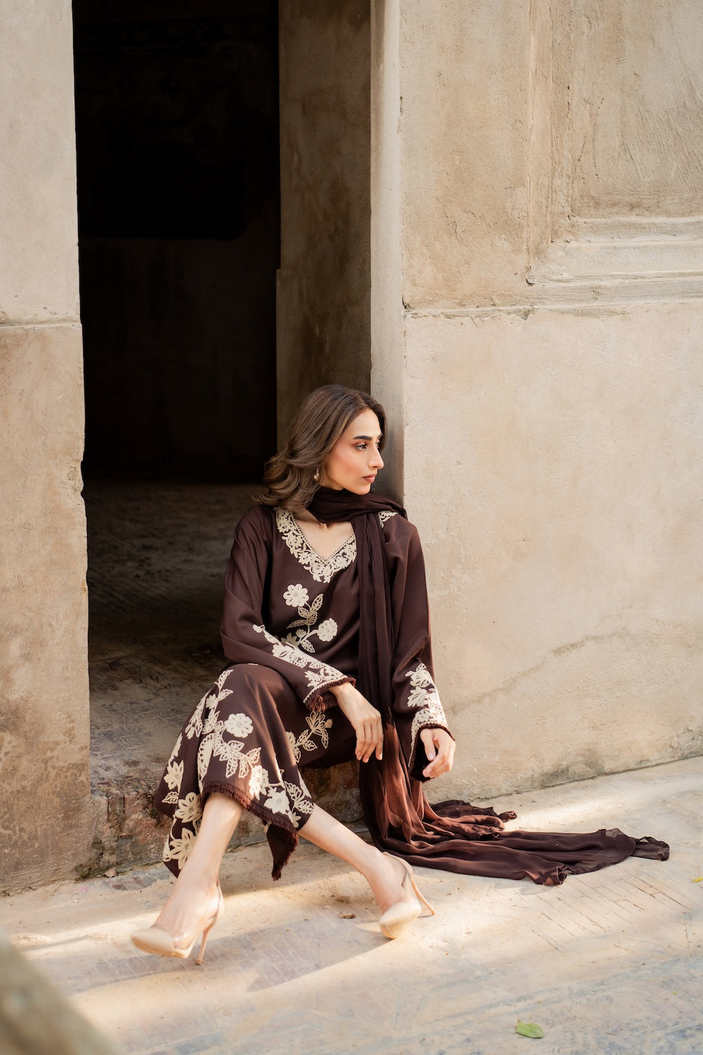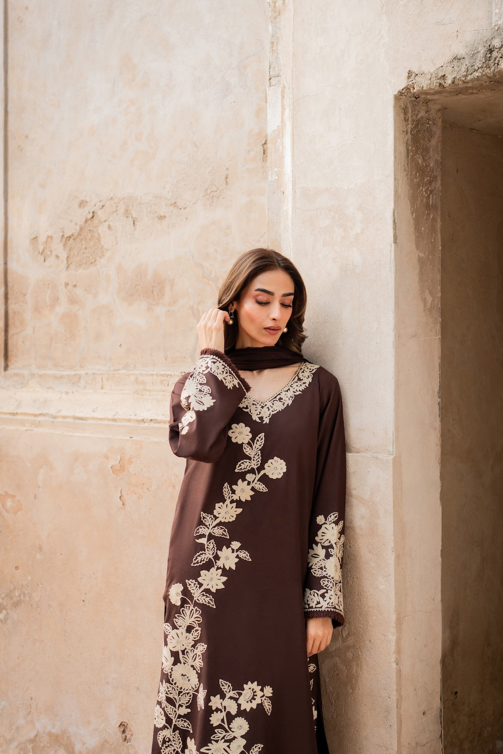 Warm marina in a rich brown palette - the floral motifs bloom across the front and sleeves, while the Aari embroidery adds texture and depth. This piece isn’t just seasonal; it’s a timeless staple that elevates any winter‑wardrobe lineup.
