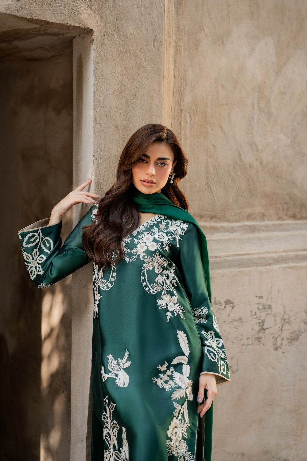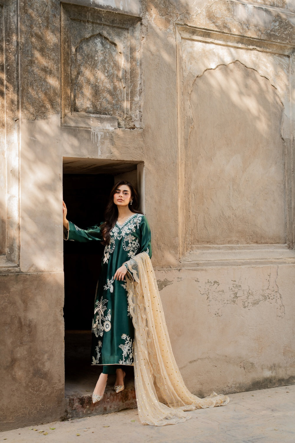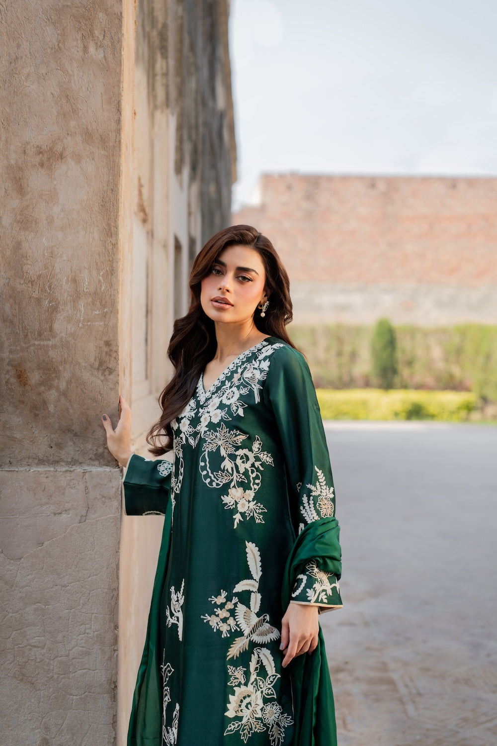Narmeen is your go-to evening ensemble: an off-white masterpiece with delicate embroidery and gold accents that elevate its elegance. Paired with matching pants and a luxurious pure sheesha silk dupatta, it’s perfect for evening soirees