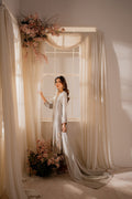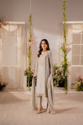 Crafted from pure tissue silk, this A-line shirt is a piece of art adorned with intricate resham embroidery that pays homage to our rich heritage. The shirt is crafted in colors that adds a touch of elegance and sophistication to the ensemble. It is paired with detailed tonal straight pants. Adorned with gold and silver nakshi, gota, sequins, dabka, and tiki stones, creating a mesmerizing and luxurious design that catches the light and adds a touch of sparkle and glamour.