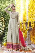 Shirt:Shirt is a Long Gown in Anarkali style made in banarsi chiffon embellished with gota, sheesha, kora, dabka, sequins, resham work with similar work on the 11 inch block printed border on the hem.