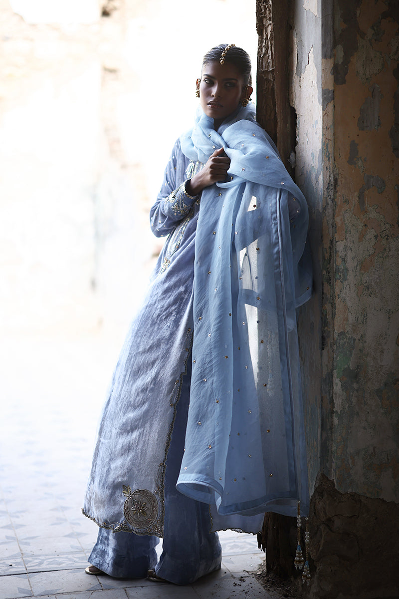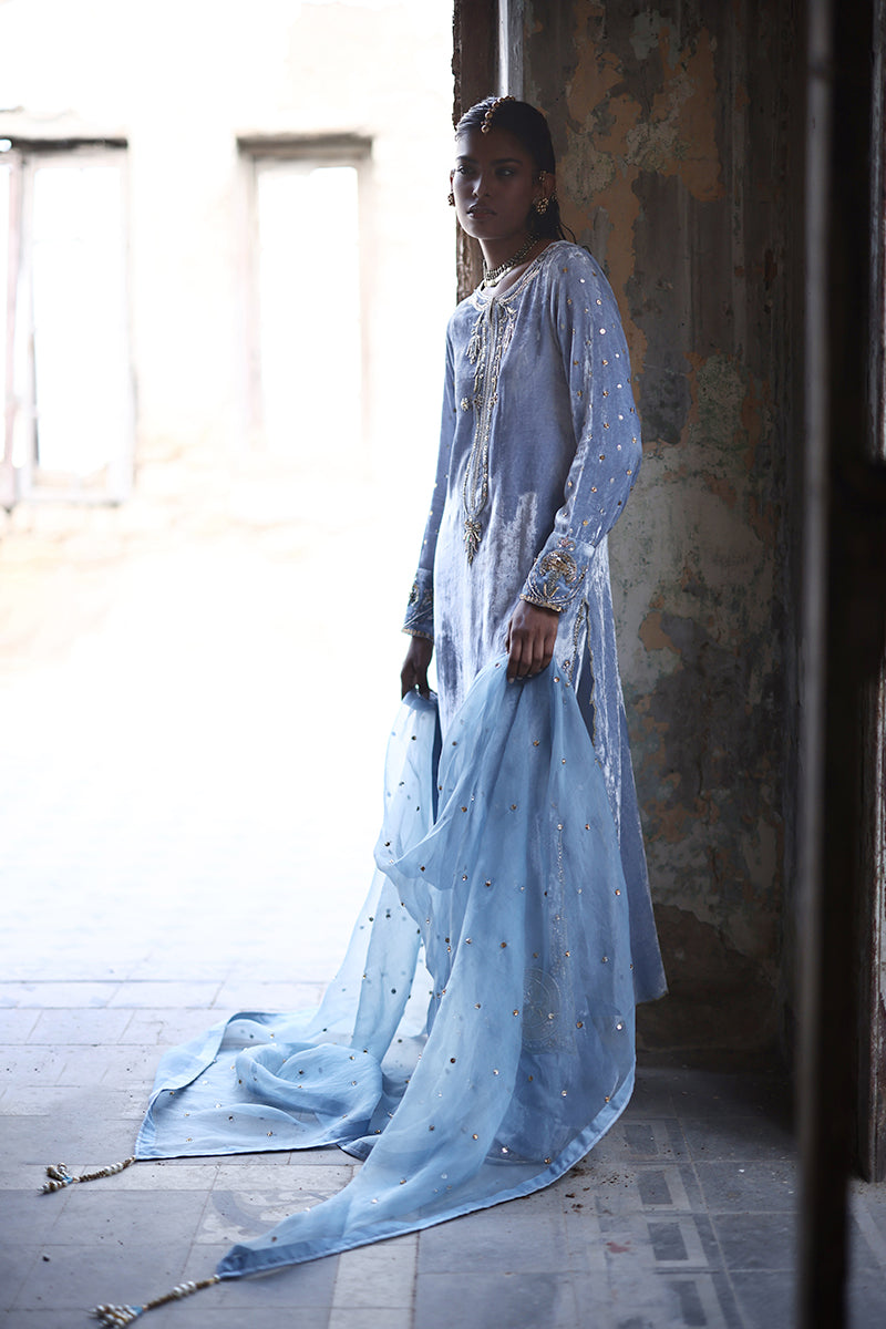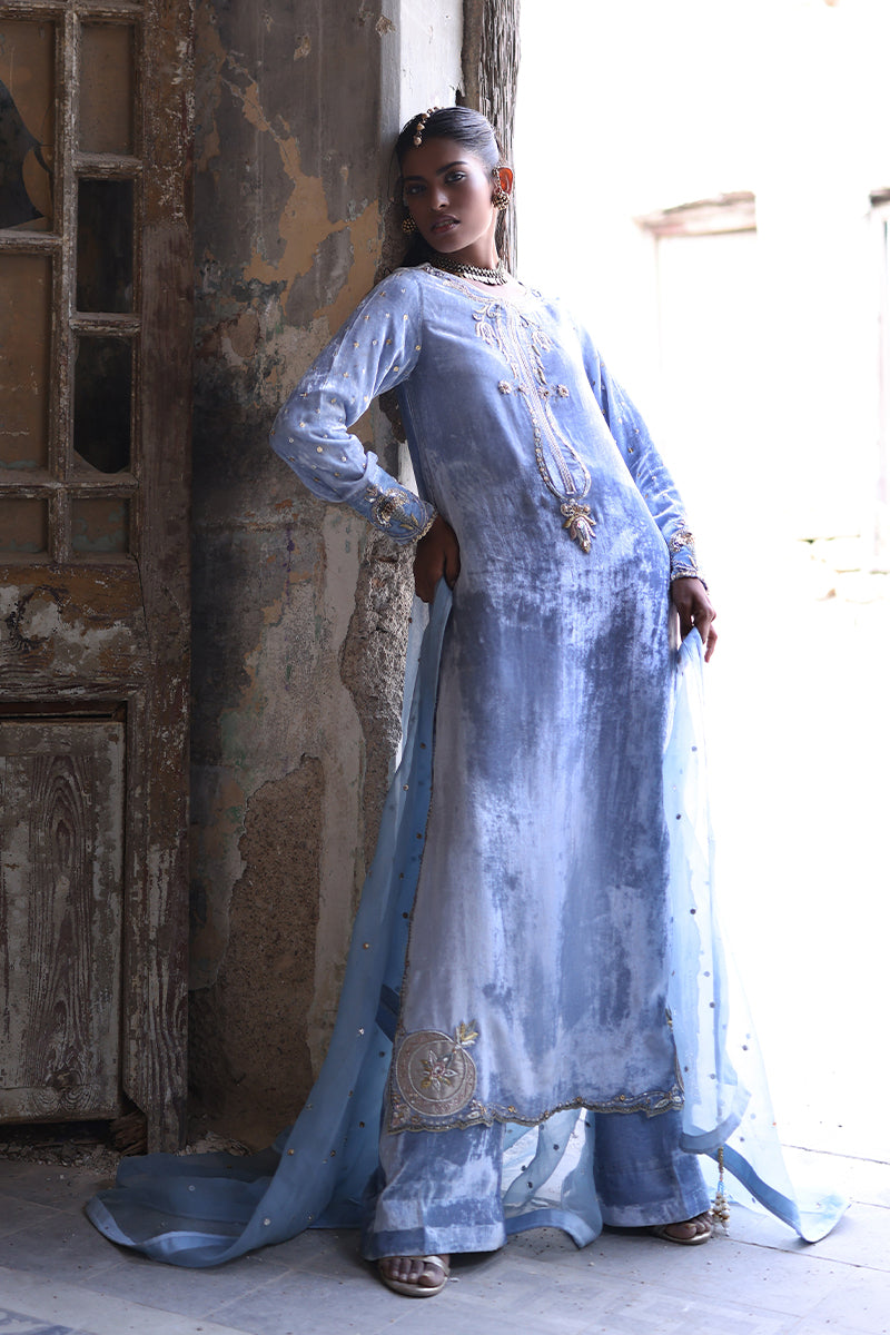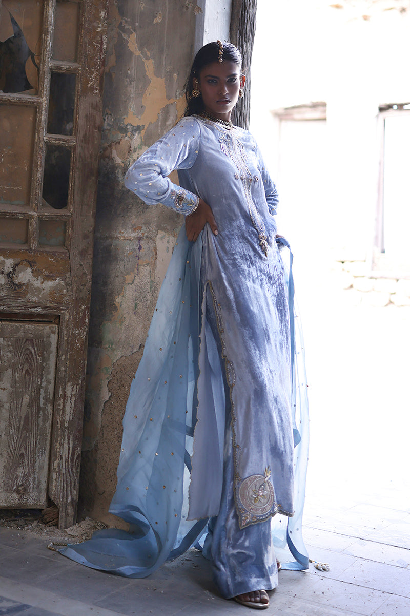 A vision of timeless allure, this formal pure velvet ensemble in two-tone Wedgwood hues is crafted to captivate. Each piece is meticulously hand-embroidered with exquisite zardozi, sequin, and crystal work, adorned with our signature Chaand Bala appliqué motifs that define the brand’s artistry.