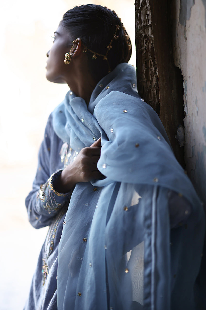 Paired with a pure organza dupatta, delicately finished with a crystal spray and handmade tassels, this ensemble is a celebration of luxury craftsmanship, elegance, and understated opulence, designed to turn every glance into admiration.