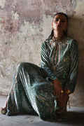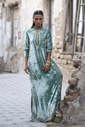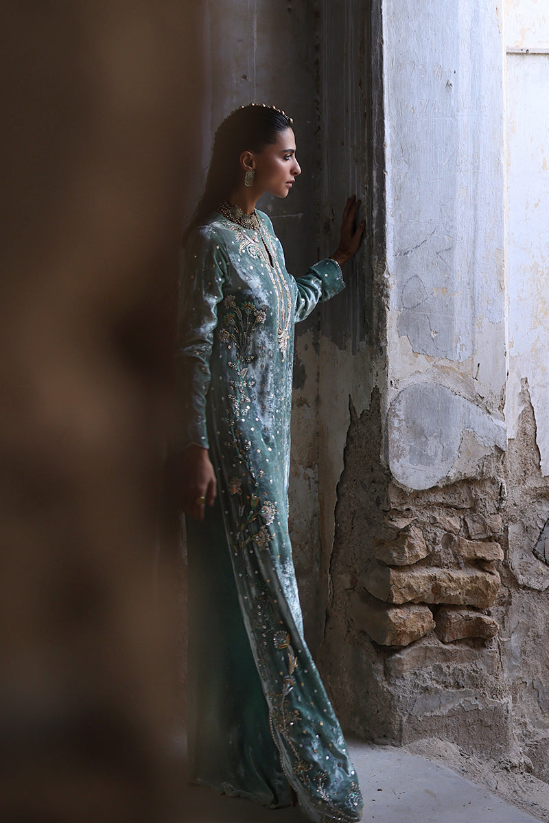 An embodiment of refined glamour, this stunning formal kaftan is handcrafted in smoky sage pure velvet, exuding richness and depth. Every inch is meticulously hand-embroidered with elaborate zardozi detailing, crystal accents, and sequin artistry, showcasing the mastery of timeless craftsmanship.