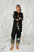 A Stunning Black Formal Shalwar Kameez with Intricate multi-Color Lotus and Floral Motifs created with Resham Threadwork. Featuring our Signature Leather Applique Work with Hand-crafted Crystal Embellished Tassels. Pair It With Leather Applique Work Dupatta (Optional) To Complete The Look.