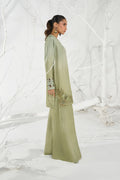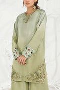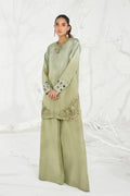 Seige Green ensemble in Ombre Dye effect. Featuring intricate zardoze hand embroidery with monotone crystals and our signature Bask Weaving Cuffs to add oomph to the outfit. Comes with matching flared trouser.